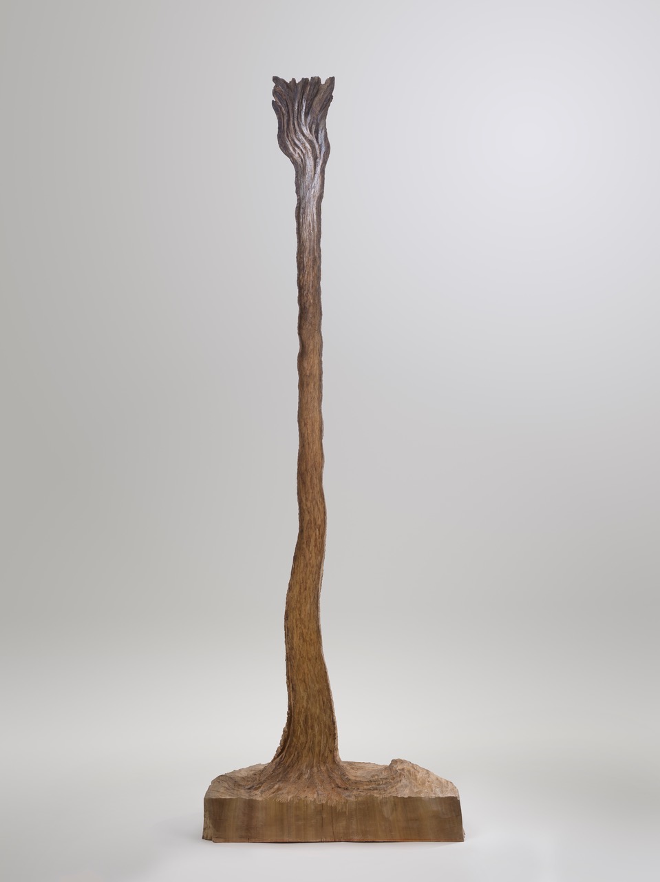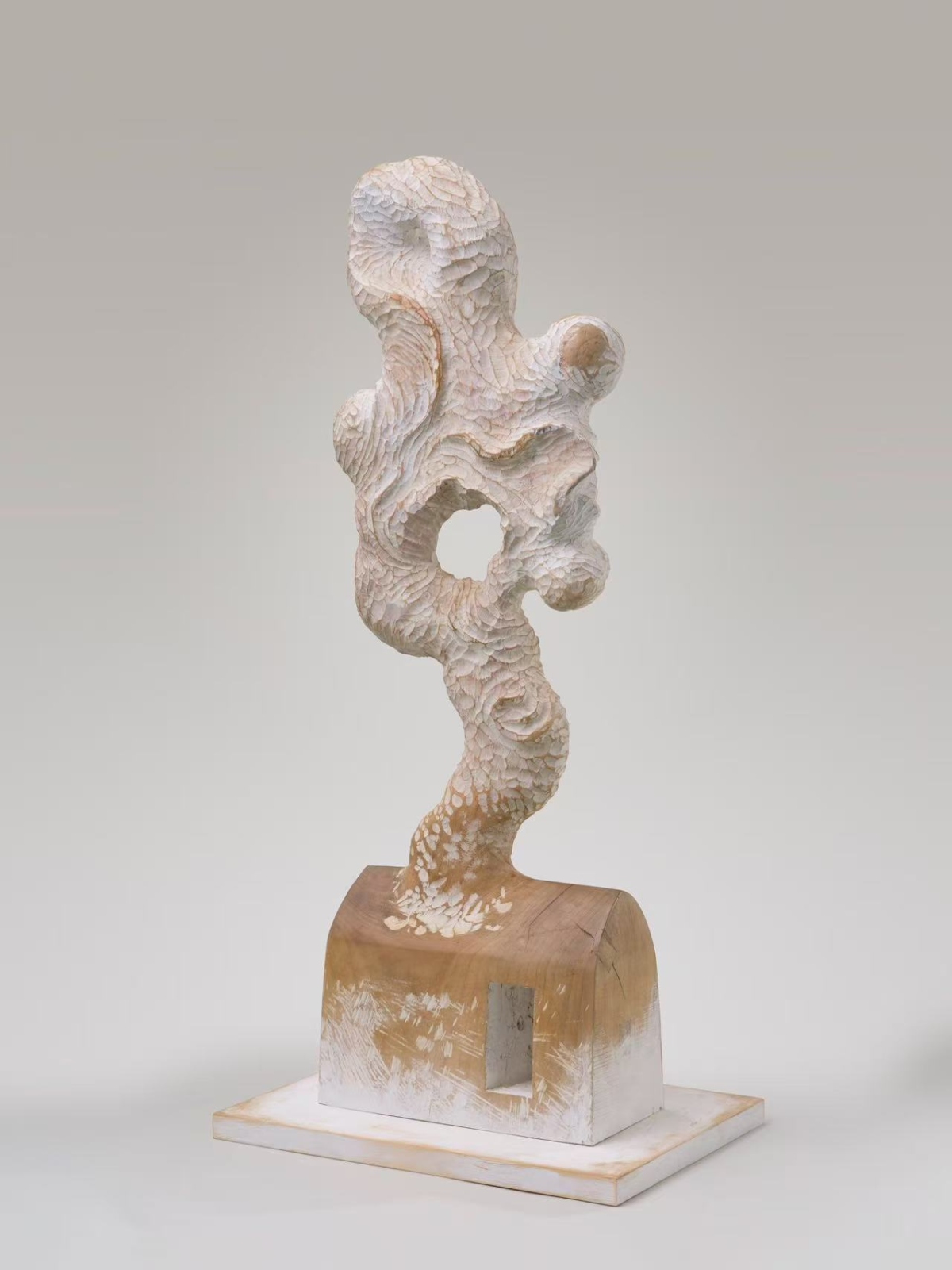 Mitsukuni Takimoto was born in Fukuoka in 1952. He moved to Italy in 1977 to apprentice to Tomonori Toyofuku, who was active in Milan at the time. Since then, Takimoto has consistently pursued a wood sculpture practice while remaining faithful to traditional techniques. Takimoto also works as an expert in the restoration of Buddhist sculptures. Under the influence of Toyofuku, Takimoto worked on abstract sculptural reliefs throughout the 1980s. In the ‘90s he shifted his style toward a more representational one. However, while these works can be called representational, he chooses only subjects like waterfalls and rivers, clouds and smoke: figures that remain in the viewer’s memory like an afterimage. The chisel marks left on the surface of these fluid shapes are simultaneously traces of the act of making, and a symbolic representation of the conscious effort to grasp indeterminate images.