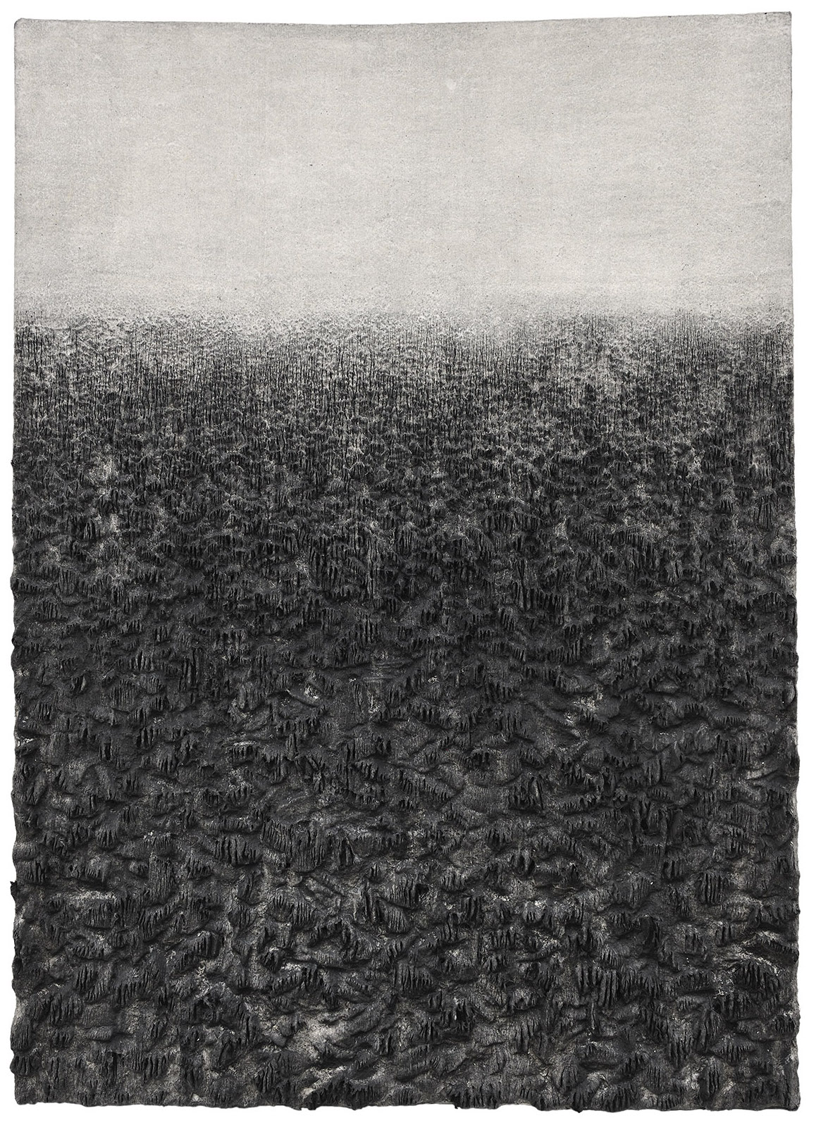 Lee’s works are characterized by their distinctive texture, which evokes a state of contemplation. To create these works, Lee employs a unique approach that involves sandwiching pieces of charcoal between multiple sheets of Korean hanji paper to create a canvas, which he then repeatedly strikes and scratches with a wire brush. The use of the wire brush brings about various changes in the texture of the canvas, as the imprint of pulverized charcoal embedded in what may be anything from a few sheets to several dozen sheets of paper creates pockmarked, monotonal works. Lee describes this process as ‘honest work’, and a way of expressing a certain ‘something’ that lurks inside of him without using his head or his brain. He says he needs to repeat this process of intense labour in order to avoid his ideas or thoughts being interfered with.